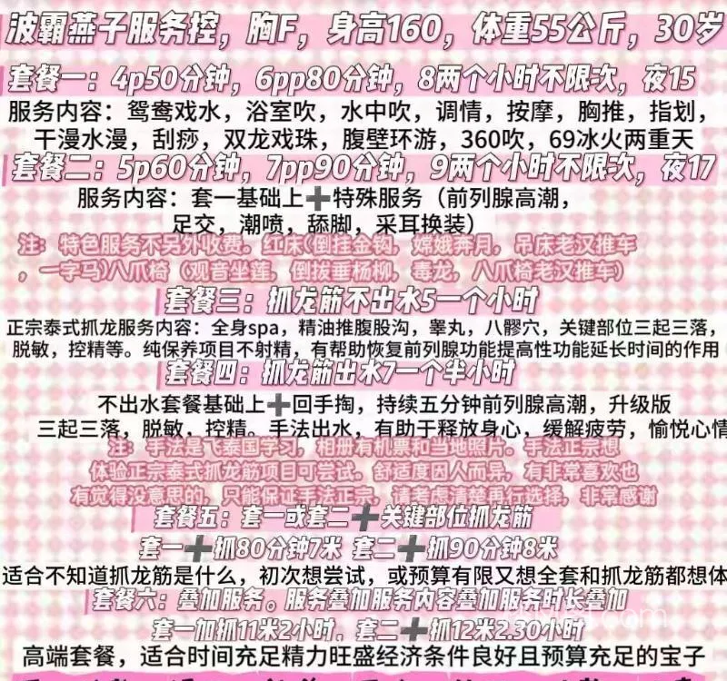 服务项目: 鸳鸯浴,抓龙筋,红床,全身spa